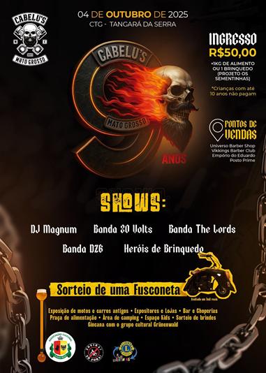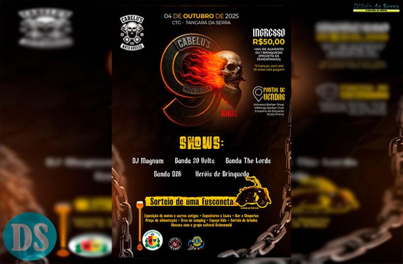 O Cabelu’s Moto Clube prepara seu nono aniversário com um evento que promete movimentar Tangará da Serra e região. A festa será no dia 4 de outubro, a partir das 16h, no CTG Aliança da Serra, reunindo motociclistas, famílias e visitantes em uma programação variada e animada.