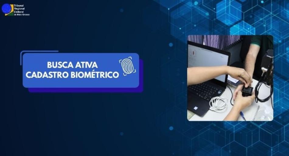 #PraTodosVerem: A imagem destaca a ação de “Busca Ativa – Cadastro Biométrico”, promovida pelo TRE-MT. À esquerda, há uma arte com fundo azul escuro e elementos gráficos digitais, contendo o título da campanha e o ícone de uma impressão digital. À direita, a foto mostra o momento em que uma pessoa realiza o procedimento de coleta biométrica, com os dedos sendo posicionados sobre o leitor digital, ao lado de um notebook e equipamentos de captura.